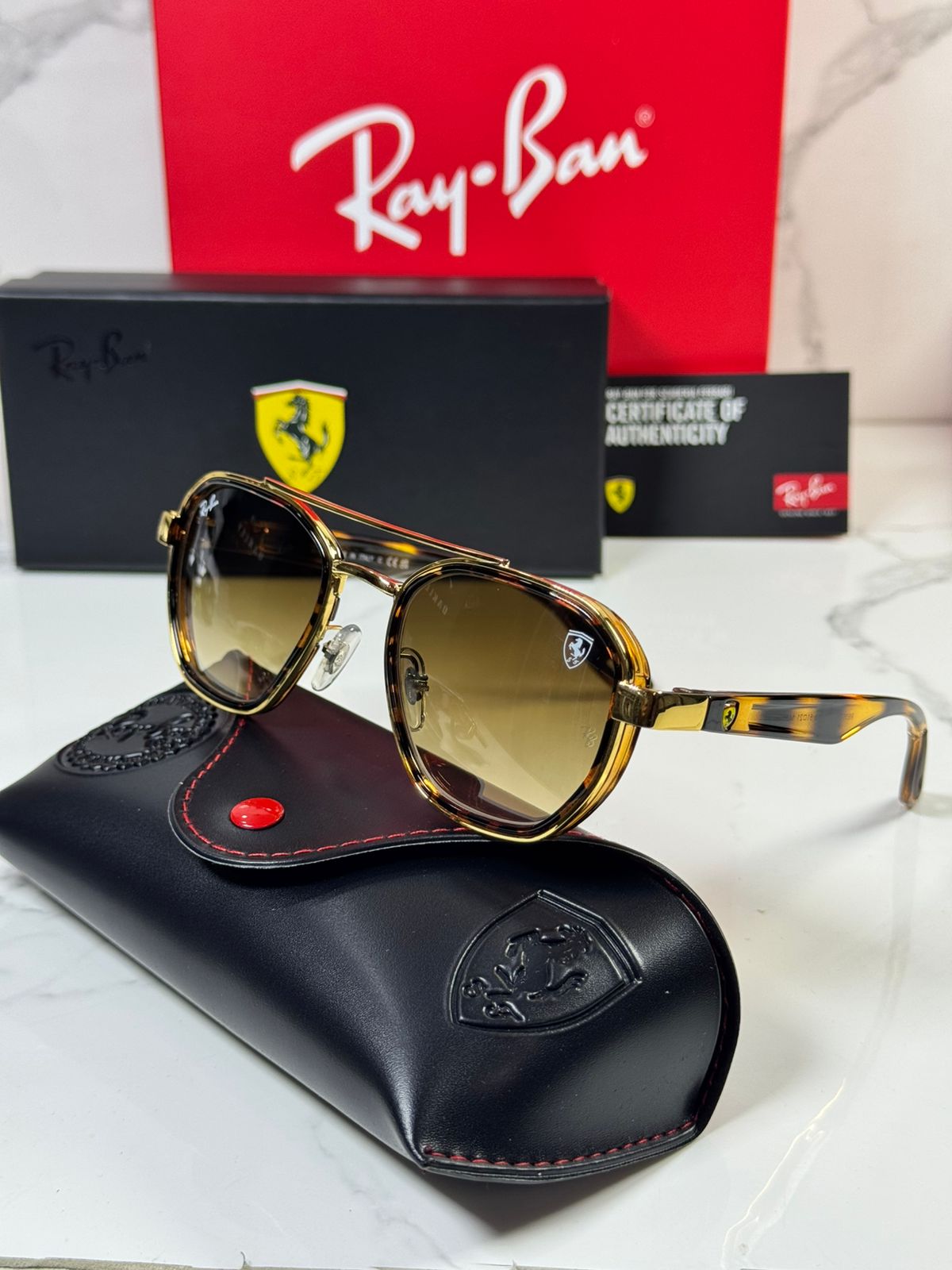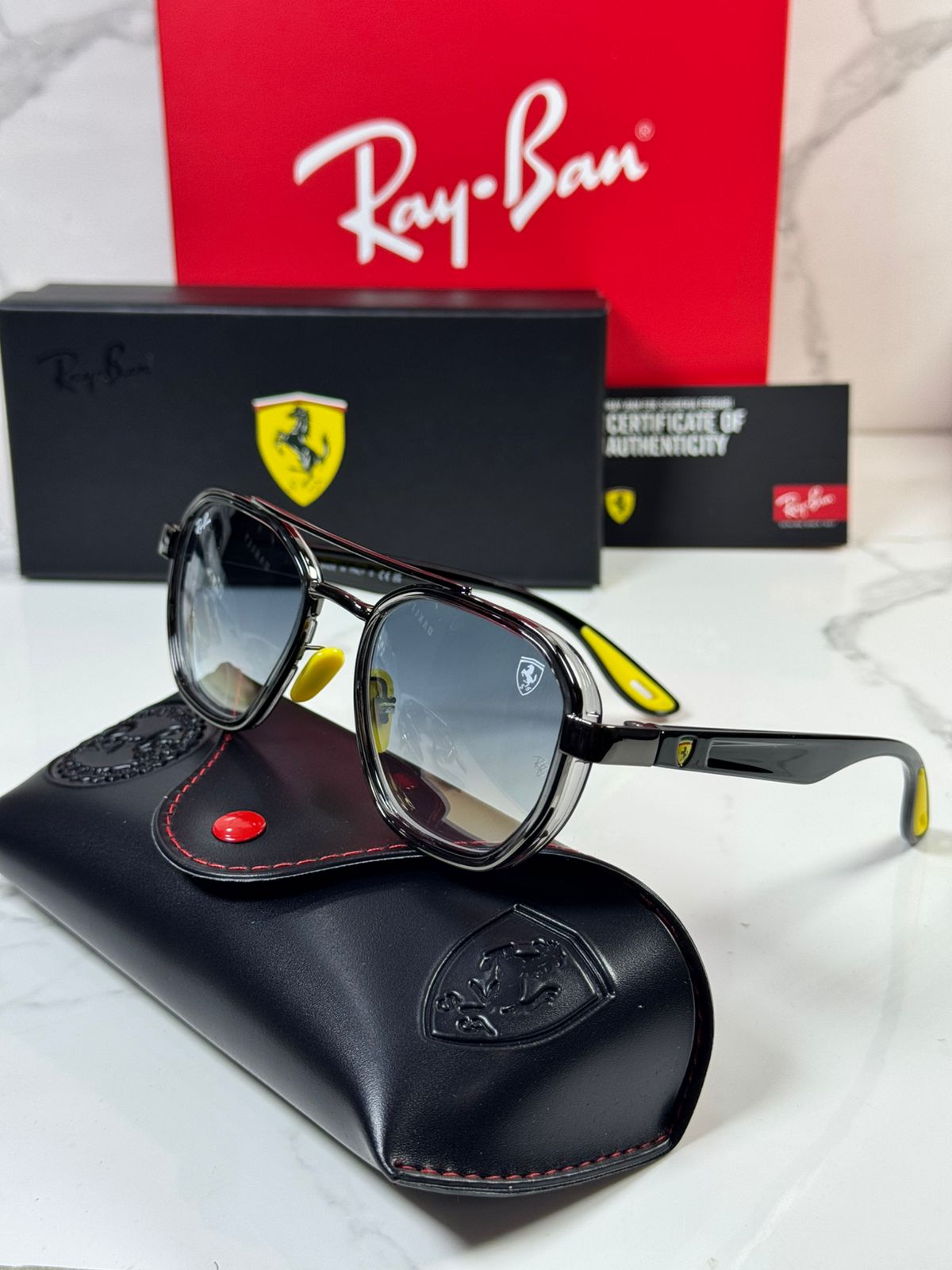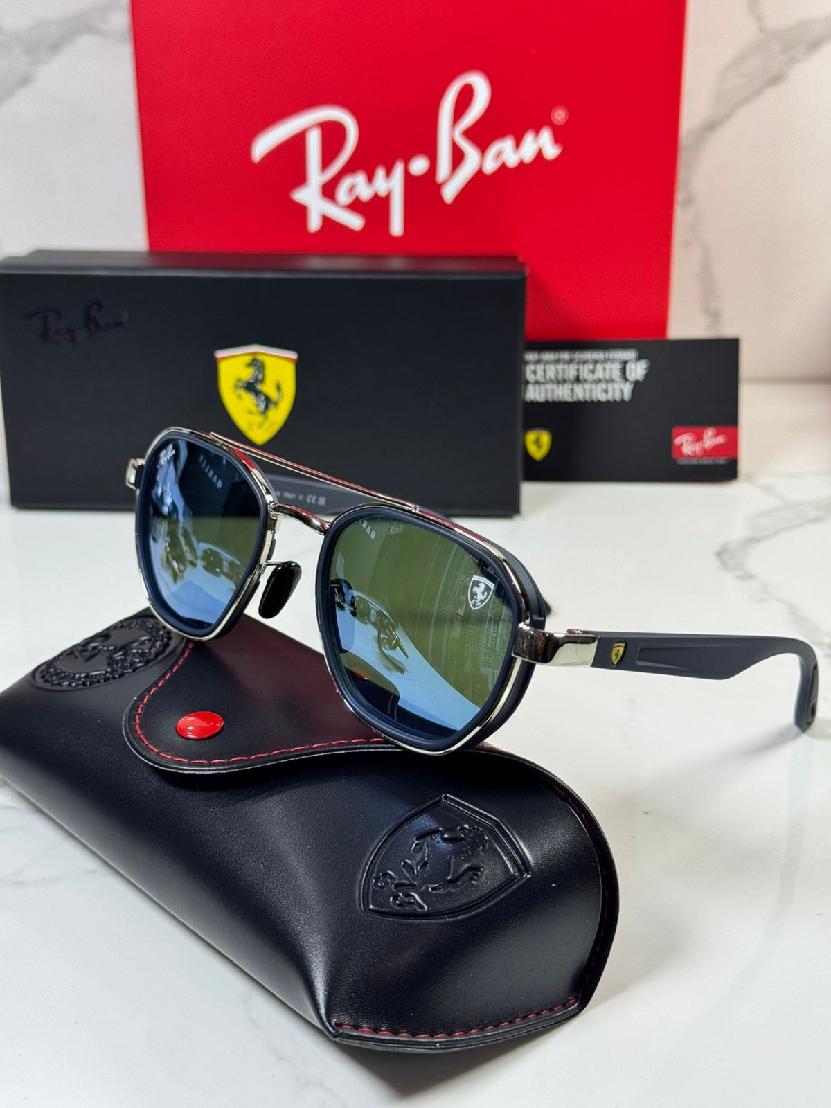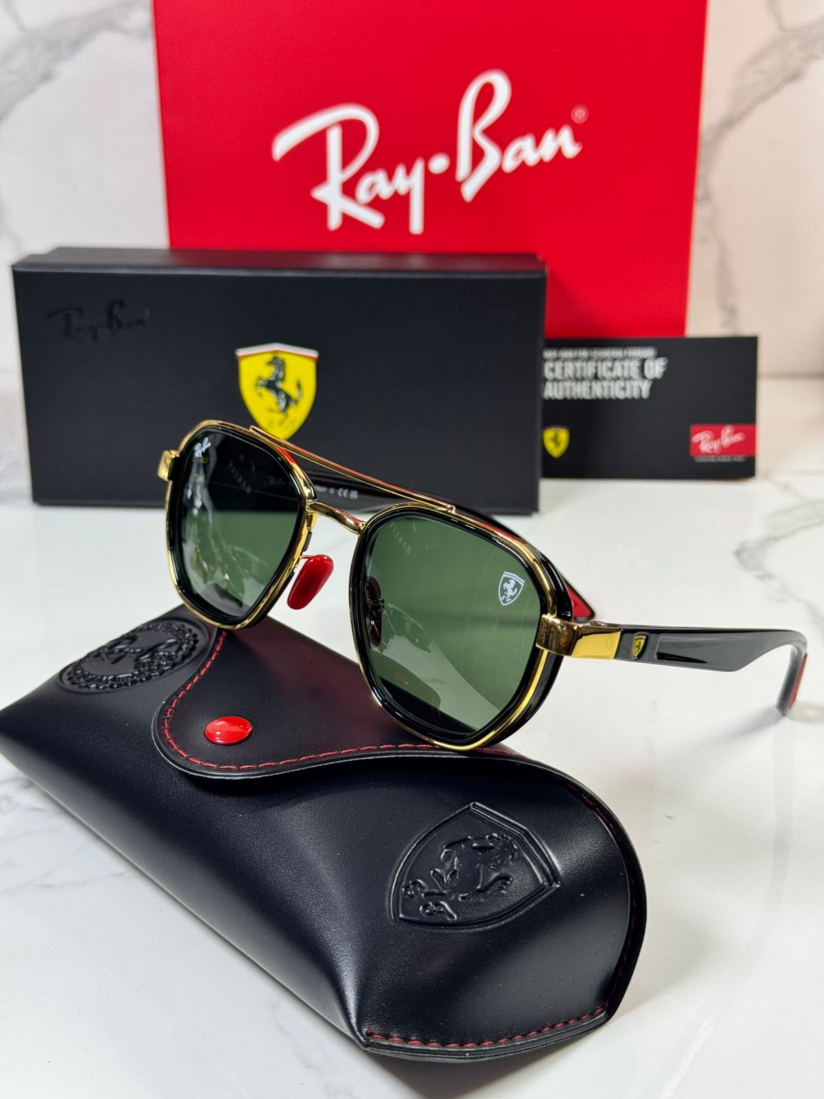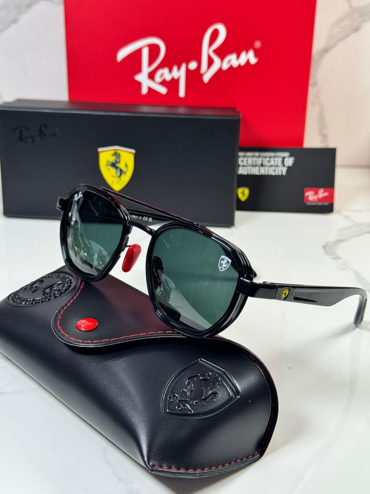 🔥 RÉPLICA PREMIUM RAY-BAN SCUDERIA FERRARI 🔥 ¡Lleva la velocidad de Ferrari en tus ojos! Réplica de calidad TOP con: ✅ Materiales premium: Acetato italiano simulado + metal ultraligero ✅ Lentes polarizadas UV400, antirrayas, 100% protección solar ✅ Diseño Aviator/Wayfarer icónico con escudo Ferrari grabado ✅ Incluye estuche Ferrari original simulado + paño microfibra 95% idéntica al original, perfecta para uso diario/extremo. ✨